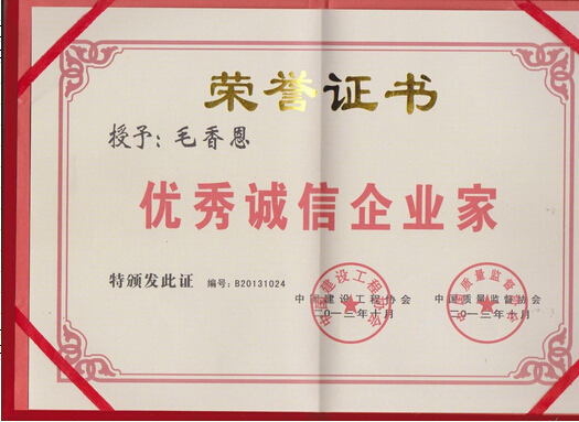 優(yōu)秀誠信企業(yè)家證書