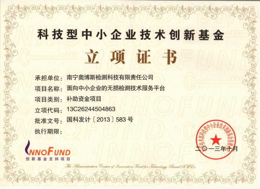科技型中小企業(yè)技術(shù)創(chuàng)新基金立項(xiàng)證書