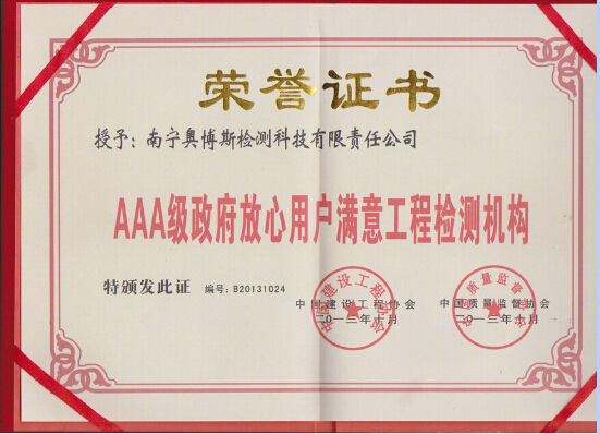 AAA級政府放心用戶滿意工程檢測機構(gòu)證書