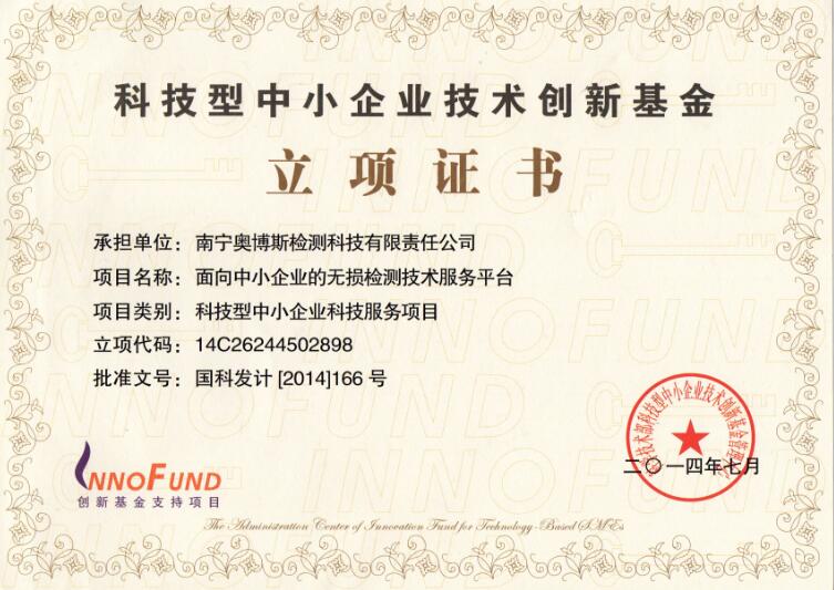 2014年科技型中小企業(yè)技術(shù)創(chuàng)新基金立項證書
