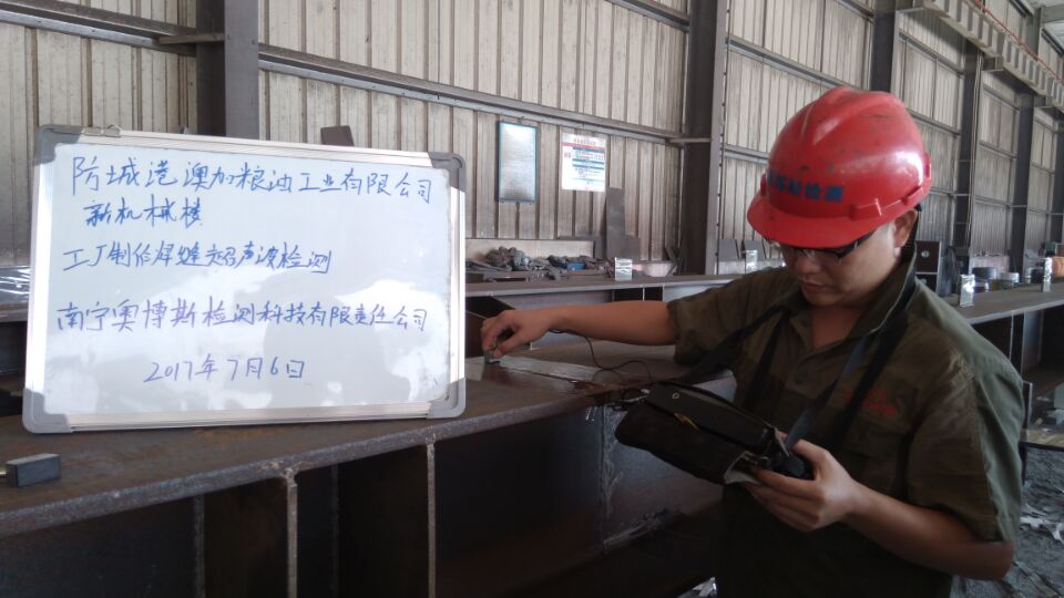 公司檢測人員7月6日在防城港澳加糧油工業(yè)有限公司新機(jī)械樓進(jìn)行焊縫探傷無損檢測。