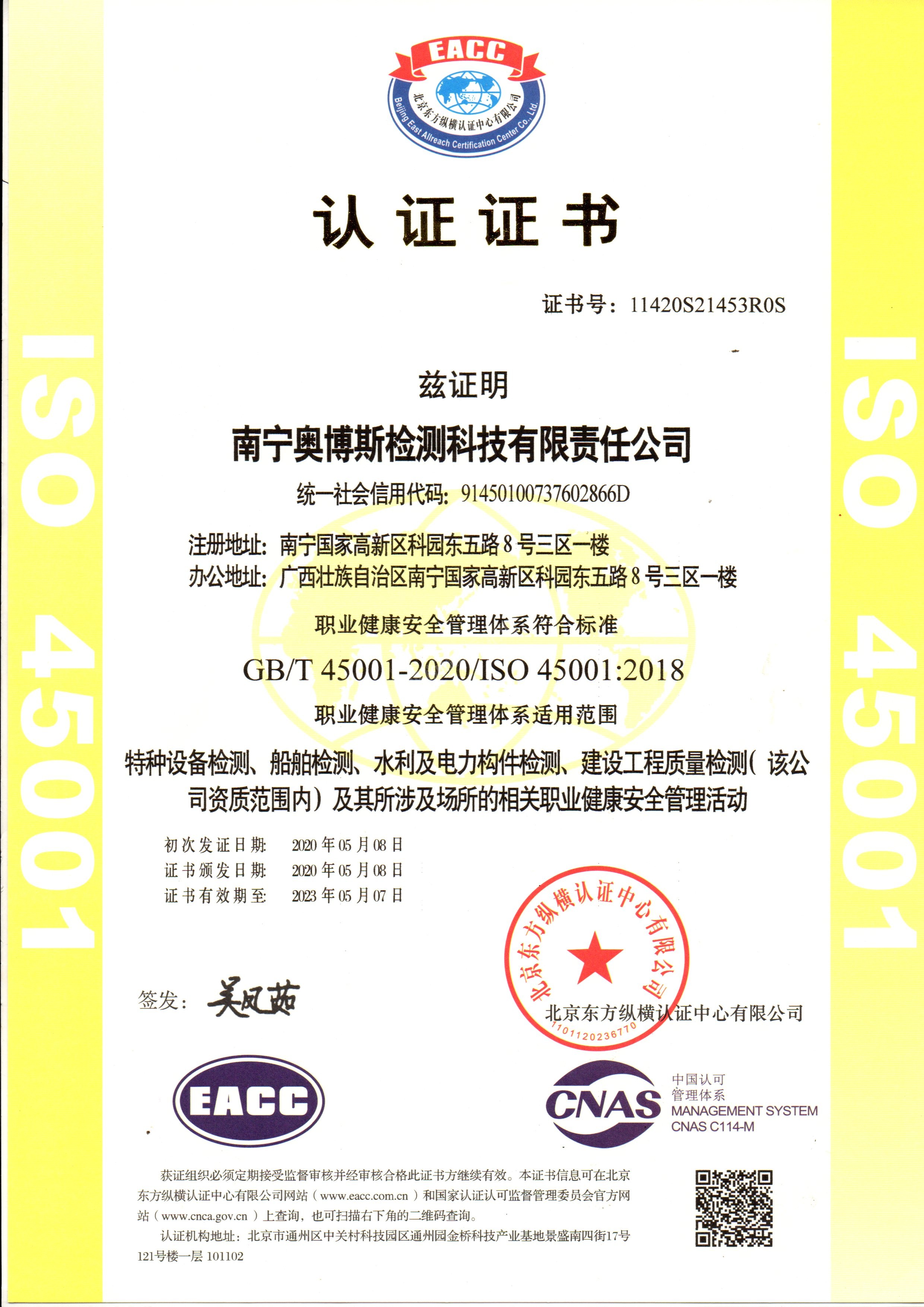 職業(yè)健康安全管理體系(特種設(shè)備、船舶檢測、水利及電力構(gòu)件檢測、建筑工程質(zhì)量檢測)認(rèn)證證書